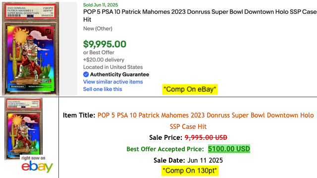 Same card. Same sale. Two totally different “comps”. Top: eBay shows the original asking price. Bottom: 130pt reveals the actual accepted offer—nearly $5,000 less. This is why misleading comps are such a problem in the hobby. If you’re not using the right tools, you could be pricing—or buying—based on fiction. Don’t fall for inflated hype. Do your homework.
