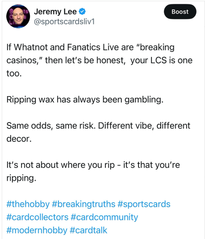 There’s been a lot of talk this week about where the real “gambling” takes place in the hobby. Is it Whatnot? Fanatics Live? Your local card shop (LCS)? Jeremy Lee stirred the pot when he said: “It’s not about where you rip – it’s that you’re ripping.” And honestly, he’s not wrong—but it’s not the full story either. Yes, ripping wax—whether online or in person—has always carried risk. You’re paying money for the chance to hit something big, knowing full well you might end up with nothing of value. That is gambling. But when you peel back the layers, it’s not just about the rip—it’s about the system surrounding it. Group breaks on streaming platforms mimic casino mechanics: randomized outcomes, inflated markups, tiered buy-ins, peer pressure, time limits, wheel spins, trade backs, duck races, confetti graphics, and rapid-fire decision-making. It’s not just risk—it’s engineered urgency. It’s marketing built to exploit attention and emotion, often with no transparency on true odds or fair pricing. Meanwhile, your LCS might offer a more grounded experience, but if they’re pricing wax based on inflated secondary markets—or even hosting breaks themselves—the line begins to blur. We’ve heard the stories: So let’s be real: Overspending is overspending. And whether it’s at your desk, on your phone, or at a storefront, the fallout is the same: regret, guilt, secrecy, and sometimes financial ruin. It’s not about demonizing rips, breakers, or stores. It’s about creating awareness of how these mechanisms function—and how easily they can hijack our self-control if we’re not careful. Collecting should be exciting—but it should also be intentional. #CollectorsMD —